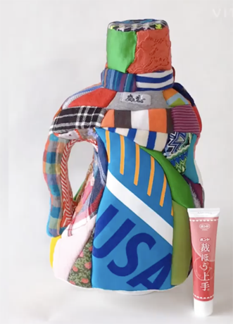 柄(がら)のバランスがいいです。実用的(じつようてき)ですね。また、部屋(へや)の飾(かざ)りにもいいのではないかと思(おも)いました。材料(ざいりょう)とした古着(ふるぎ)、古布(こふ)のそれぞれが持(も)っている色(いろ)や柄(がら)のいい部分(ぶぶん)をうまく生(い)かした作品(さくひん)です。