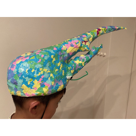 見事(みごと)な作品(さくひん)です。大きさ、配色(はいしょく)、全体(ぜんたい)の形(かたち)など実(じつ)に素晴(すば)らしい!「ツノがむずかしかった」とコメントがありましたが、見ただけでも十分(じゅうぶん)わかります。ツノの素材(そざい)えらび、接着剤(せっちゃくざい)の使(つか)い方(かた)などもよく研究(けんきゅう)したと思(おも)います。私(わたし)もかぶってみたい作品です。