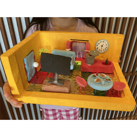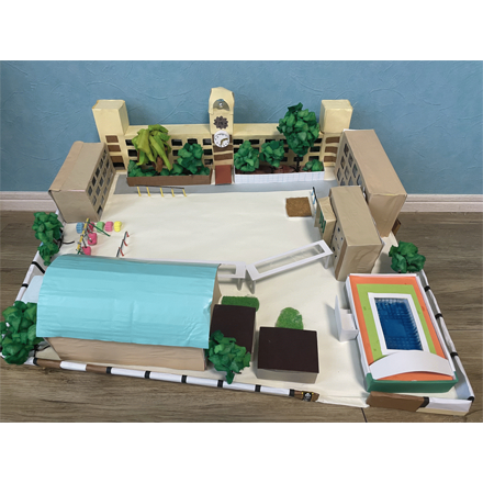 学校の写真(しゃしん)を本当(ほんとう)に何度(なんど)も見て作(つく)っているのがよくわかります。校舎(こうしゃ)や遊具(ゆうぐ)などの縮尺(しゅくしゃく)がとてもリアルで写真から飛(と)び出たようなできばえです。
