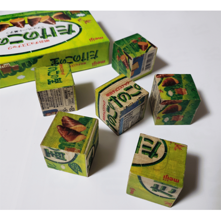 「ボンド 木工用(もっこうよう)」を使(つか)い、パッケージを転写(てんしゃ)する手法(しゅほう)に驚(おどろ)きました。6面(めん)すべてに加工(かこう)してあるのがすごい!このまま、おもちゃで商品化(しょうひんか)できそうです。