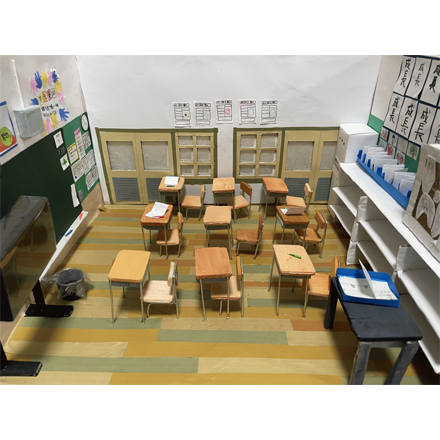 机(つくえ)や椅子(いす)の足をつくる工夫(くふう)や教室に貼(は)られている「習字(しゅうじ)」まで再現(さいげん)している点(てん)など本当に見事(みごと)な作品(さくひん)です。