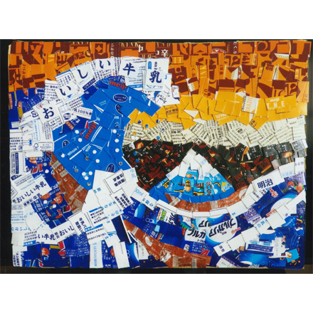 商品(しょうひん)のパッケージの色見(いろみ)を巧(たく)みに使(つか)って、迫力(はくりょく)のある波(なみ)と存在感(そんざいかん)のある富士山(ふじさん)、かっこいい空模様(もよう)に仕上(しあ)げていてとても驚(おどろ)き、感動(かんどう)しました!