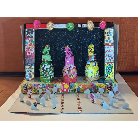 キラキラのスポットライトやプリーツのすそは、つつみ紙(かみ)をじょうずにつかって、かがかせているアイデアもすごいです。それぞれのあきばこや容器のとくちょうをめいっぱいひきだしている作品(さくひん)だと思(おも)いました。