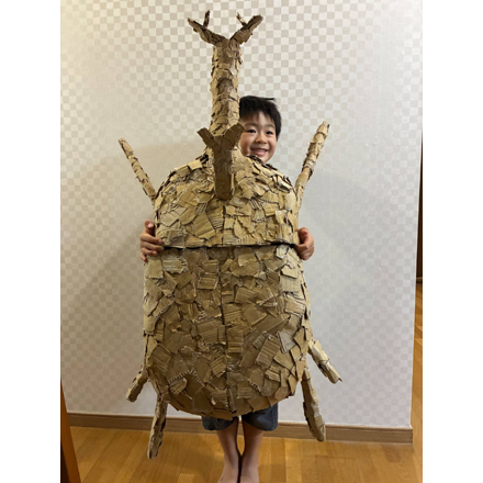 まず最初に、若旦那さんの体よりも大きいカブトムシにびっくりしました! 本物のカブトムシをよく見ながら作ったそうで、足の形やツノの先までとてもリアルですね。 写真を見ると、骨組みからていねいに段ボールを“ボンド”で貼っていって、少しずつ立体になっていくようすがよくわかって、とても楽しかったです。 こんなにも大きい作品を作るのは大変だったと思いますが、がんばりが伝わってきて、すごいな!!と思いました。