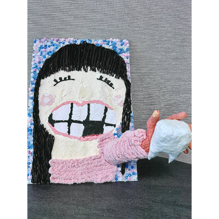 歯が抜けたという瞬間を作品のテーマにして、立体的に表現しようとしたアイデアにビックリ! 歯が抜けた時の喜びが表情に現れていて、しかも大きな歯を持って突き出した手の迫力が、まるで「ぬけたー!」という声が聞こえるようでした。背景をビースでしきつめたことで、歯を突き出す作品のインパクトをちょっとやわらかくして、よい工夫だと思いました。