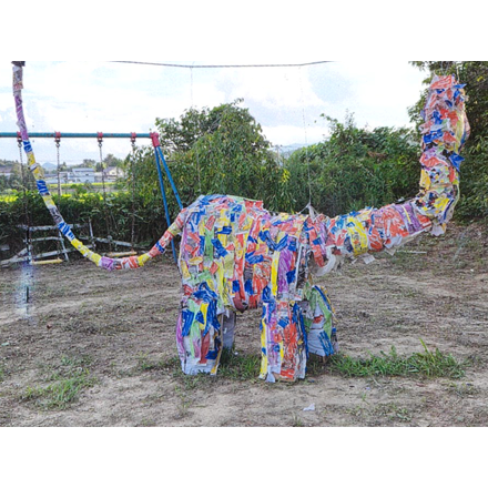 なんといっても、この大きさに圧倒されました。色をぬって貼り重ねた新聞紙や古い布が、恐竜のどっしりとした存在感を出しつつ、カラフルでわくわくするような印象を持ちました。長い首としっぽが立つように針金でつり上げているのも、見逃せないポイント。今にも歩き出しそうなこの作品の迫力を演出しています。まさに「わたしの恐竜さん」ですね!