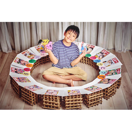 大阪万博の「大屋根リング」のミニチュア版といってもいいほどの完成度! 本物の木組みに近づけて表現するために、段ボールの短い棒を大量に作ってくみ上げたうえ、きれいなリング状になるようにつなげてあります。しっかりと計算して設計し、根気よく作業した大変な力作です。リング上には、『小学一年生』の表紙をかざってくれていて感激!小学館のロビーにかざりたいほどです!