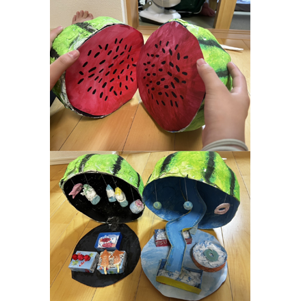 パッと見はスイカで、パカッと開くとウォータースライダーが!?夏の思い出がスイカの中にあるというファンタジーな作品ですね。まず、スイカの中に思い出をとじこめたという発想がステキだと思いました。プールだけでなく、お祭りの屋台のおいしい食べ物もぶら下がっていたり、並んでいたりして、楽しい思い出の中に入り込んだような気持ちになりました!