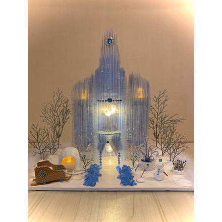 ストローとビースの素材の透け感をいかした氷のお城。豆電球をつけることで、より雰囲気のある透明感がまして、まるで映画に出てくるような幻想的なお城になっていますね。